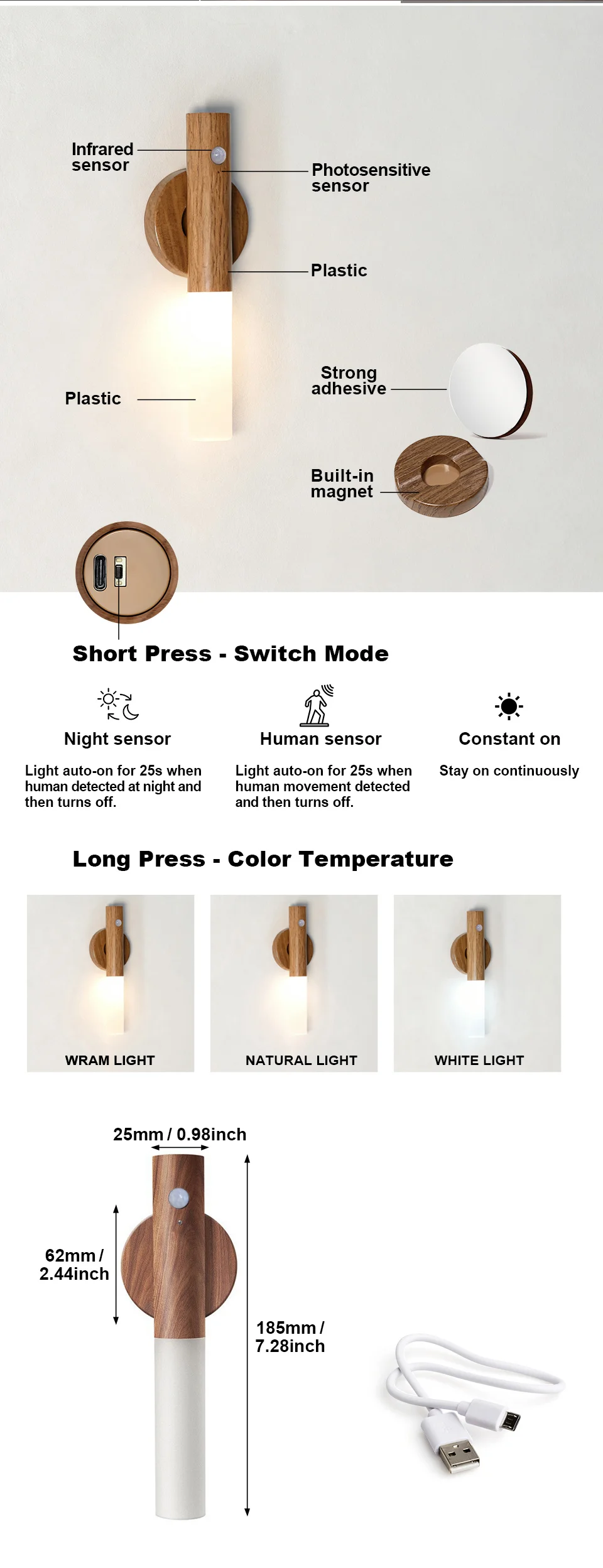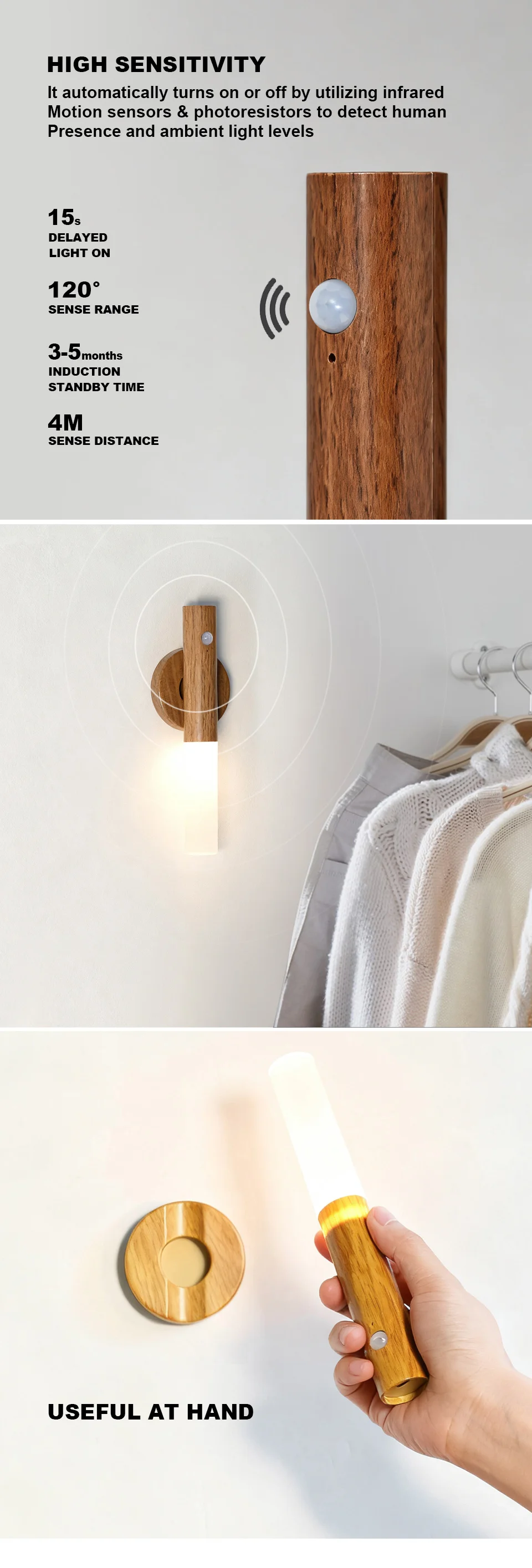 Smart Motion Sensor LED Wall Light LED Rechargeable Magnetic Wall Lamp Night Light Wood Wall Light Kitchen Cabinet Light Lamp